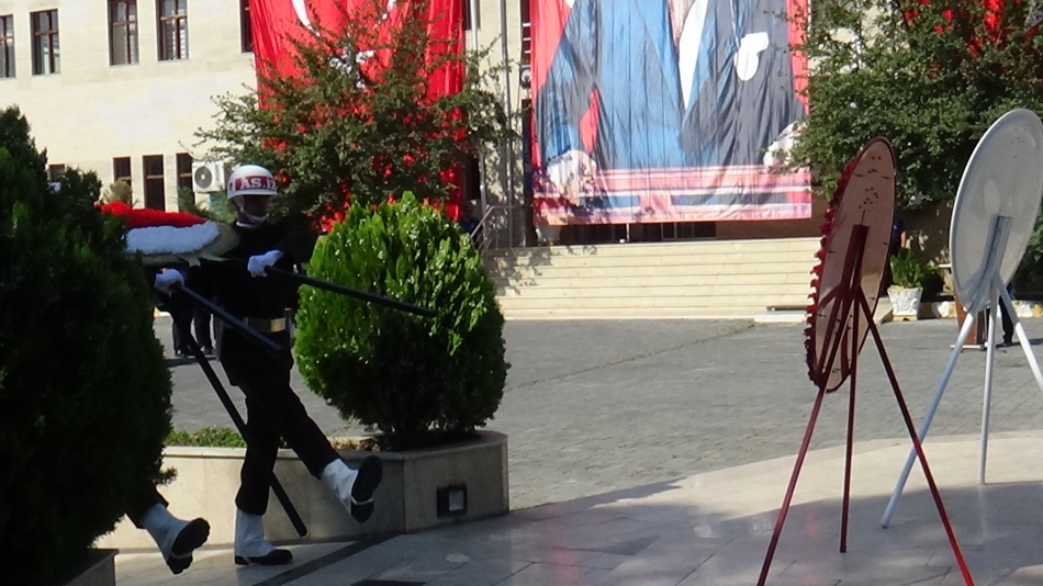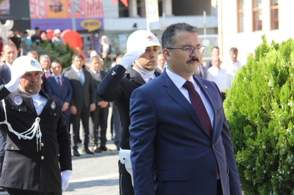 Zübeyde Hanım bulvarında bulunan Belediye önündeki Atatürk Anıtı’na çelenk konulmasıyla başlayan tören, saygı duruşu ve İstiklal Marşı’nın okunması devam etti.