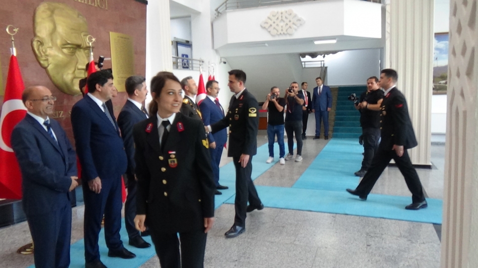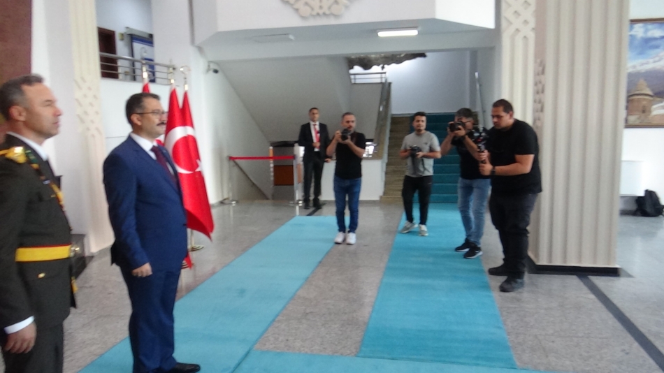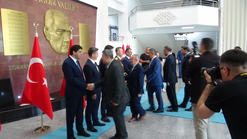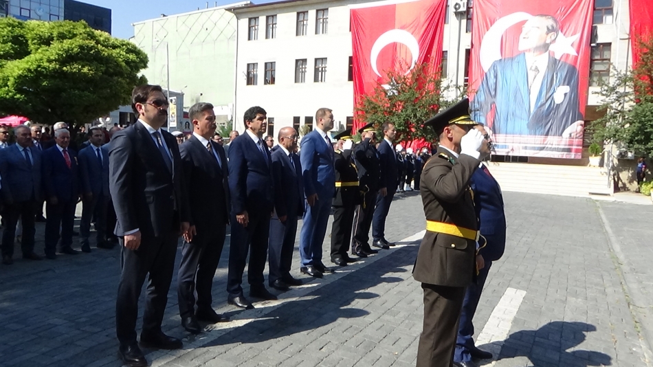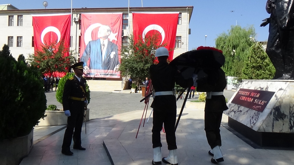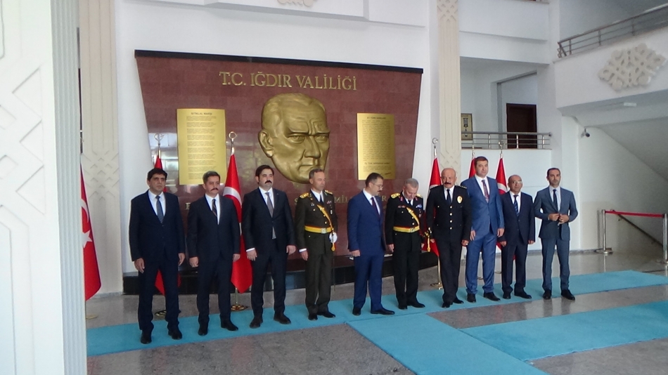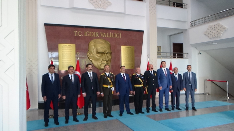 Çelenk sunulması sonrası Vali/Belediye Başkan V. Ercan Turan, ve 5. Hudut Alay Komutanı P. Albay Cavit Tütüncü,, Valilik binasında protokolün tebriklerini kabul etti.