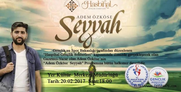 "ADEM ÖZKÖSE İLE HASBİHAL GENÇLİK SOHBETLERİ SEYYAH" Gençlik ve Spor Bakanlığı tarafından düzenlenen ilimiz Gençlik Merkezinin organizasyonu ile ağırlanacak olan “Hasbihal Gençlik Sohbetleri “ kapsamında ilimize gelecek olan “Seyyah ve Cennete Otostop” gibi kitapların sahibi Gazeteci – Yazar Adem ÖZKÖSE’nin “Hasbihal Gençlik Sohbetleri” programına bütün halkımız davetlidir. Yazarımız ayrıca Gençlik Merkezinin Has Odasında “Kitap Okum