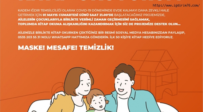 Kıymetli kitapseverler KADEM Iğdır Temsilciliği tarafından COVİD-19 döneminde evde kalmayı daha zevkli ve anlamlı hale getirmek için ailelerin çocuklarıyla birlikte verimli zaman geçirmesini sağlamak, toplumda kitap okuma alışkanlığını kazandırmak, aileler olarak çocuklara örnek olmak için 01.05.2021 Cumartesi günü saat 21.00 de "Ben de Ailemle Kitap Okuyorum" projesi başlatılacak projeye katılarak ailesiyle birlikte kitap okurken çekilmiş fotoğrafını 0535 203 55 31’nolu WhatsApp hattına gönderen ilk 50 kişiye kitap hediye edilecektir.”