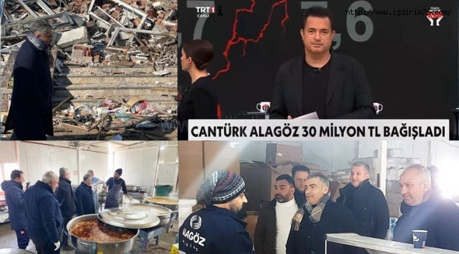 Alagöz Holding Yönetim Kurulu Başkanı Cantürk Alagöz depremin meydana geldiği ilk günden itibaren tüm ekibi ile birlikte sahada çalışmalarını yürütmekte, konteynır, ilaç, serum, gıda, günlük 7 bin kişilik sıcak yemek, hava ulaşımı kısaca her alanda yardımlarını devam ettirmektedir.