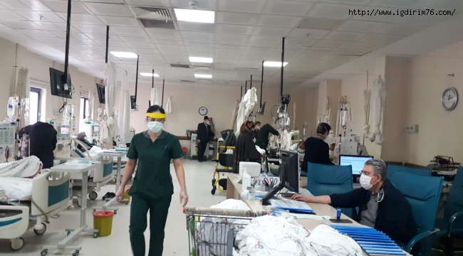 Iğdır Devlet Hastanesi’nin Hemodiyaliz Merkezi pandemi nedeniyle üç vardiya olarak çalışmaya başladı. Kovid 19 hastalığına yakalanan testi pozitif olan bazı hastalar akşam saat 17.30 dan sonra diyaliz tedavisi görmeye başladı.