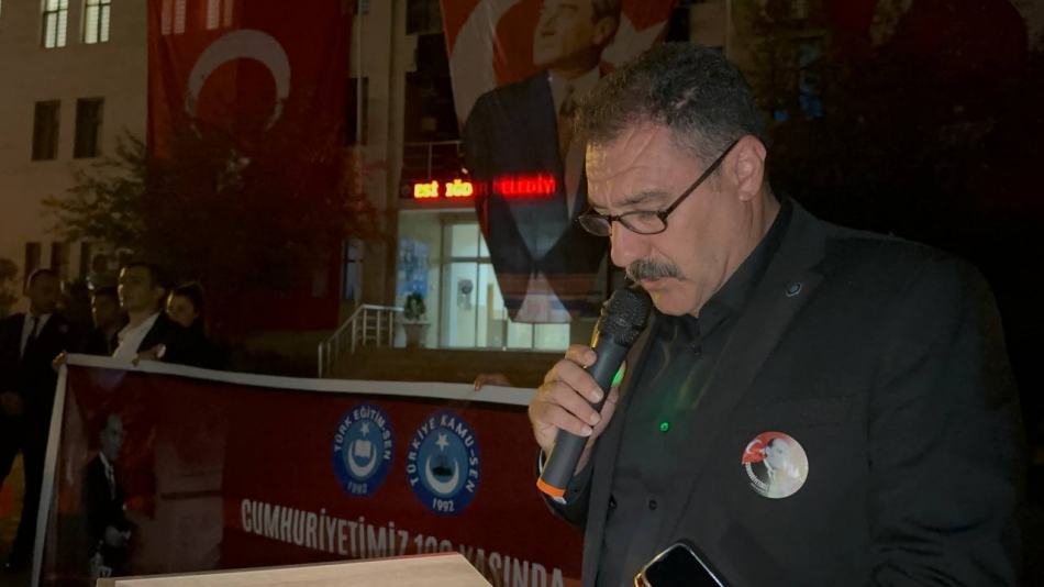 Türkiye Cumhuriyeti; mazlum milletlere emsal olan muhteşem bir mücadelenin zafer tacıdır. Türkiye Cumhuriyeti; Türk milletinin yüksek şuurunun, engin iradesinin, kutlu kudretinin şeref nişanesidir. Türkiye Cumhuriyeti; Türk milletinin 20. Yüzyıla mührünü vurduğu Türk Mucizesi’dir. Türk eğitimcileri olarak; Cumhuriyetimizi, tıpkı kuruluş felsefesinde olduğu gibi, ilmin, fennin ve aklın ışığında, demokratik bir izanla daha büyük bir azimle, daha içten bir kararlılıkla ikinci yüzyıla taşıma görev ve sorumluluğunu üstlenecek, milli bekamız için yılmadan mücadele edecek, harici ve dâhili tüm tehdit unsurlarını bertaraf edecek nesiller yetiştirmeye devam edeceğiz. Fikri hür, irfanı hür, vicdanı hür nesiller yetiştirmeyi miras bırakan Başöğretmenimizin izinden, kahraman ecdadımızın emanetini sonsuza dek koruyacak ve daha da güçlendirme azminden geri durmayacağız. Cumhuriyetimizi inşa eden kurtarıcı ve kurucu irade ile, Anayasamızda anlamını bulan temel değerler ile ve milli irade ile husumeti olan, cumhuriyetimizin birleştirici ve bütünleştirici gücüne bölücülük ve nifak tohumları ekerek zarar vermeye çalışan köhne zihniyetin emellerini dün olduğu gibi bundan sonra da boşa çıkaracağız. Tarih şahit olsun ki; naçiz vücutlarımız bir gün elbet toprak olacaktır, fakat Türkiye Cumhuriyeti ilelebet payidar kalacaktır. Cumhuriyetimizi kuran aziz ecdadımız emin olsun ki; onu yükseltecek ve yaşatacak olan ve 21. asrı “Türk Yüzyılı” kılacak olan bizleriz. Cumhuriyetimizin kurucusu Mustafa Kemal Atatürk’ü, fikir ve yol arkadaşlarını, Türk istiklali ve istikbali için muazzam bir mücadele veren şühedayı rahmet ve minnetle yâd ediyoruz. Aziz ruhları şad olsun. Cumhuriyet Bayramı kutlu olsun” dedi.