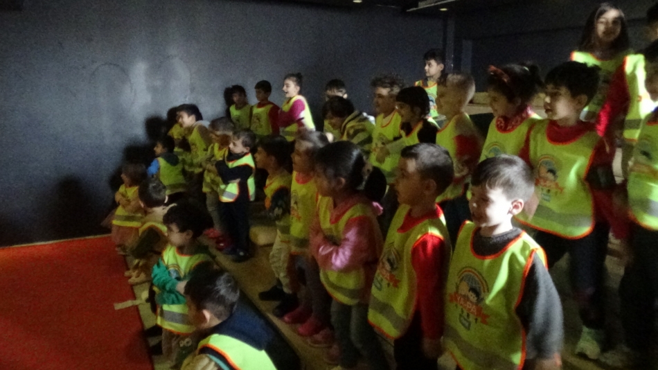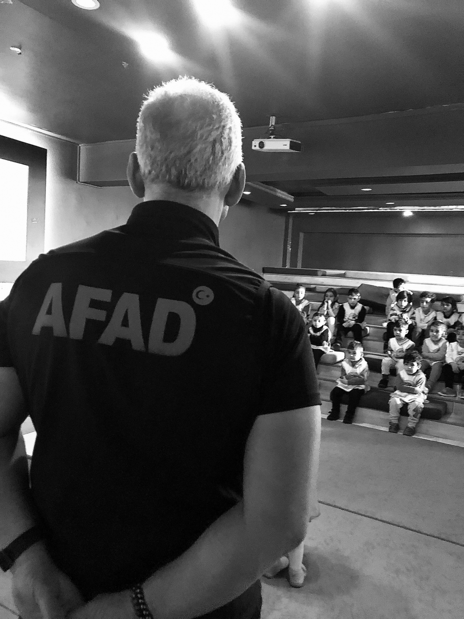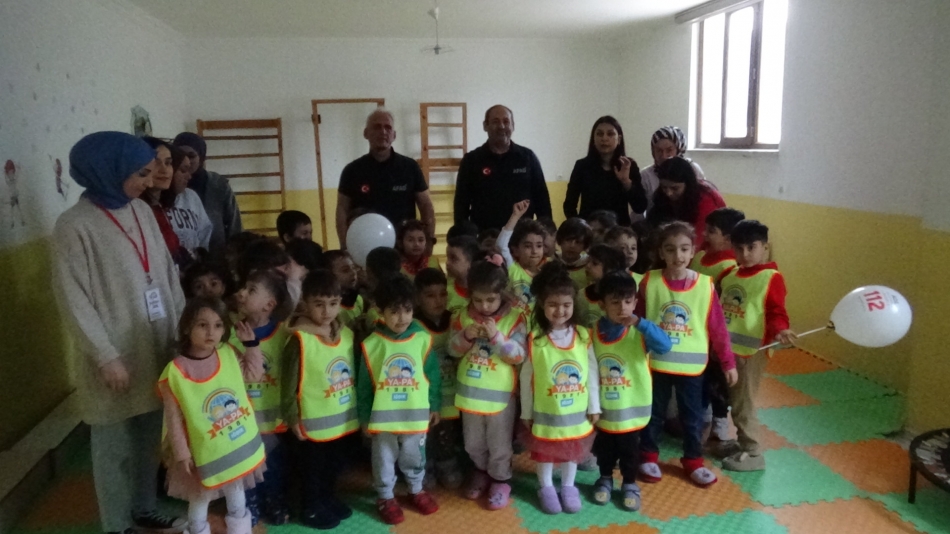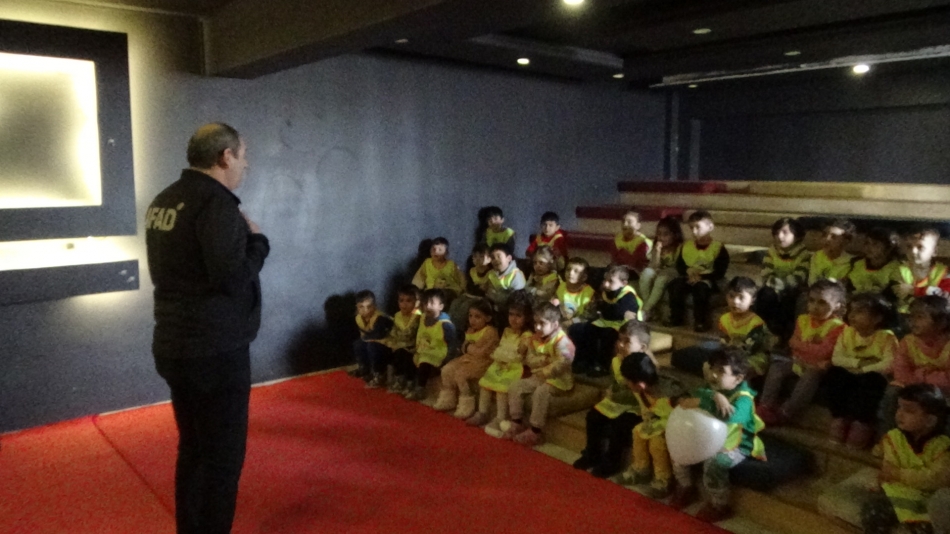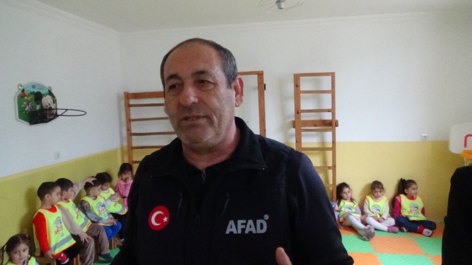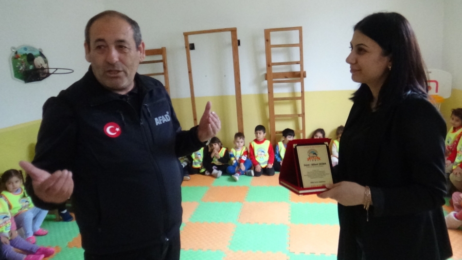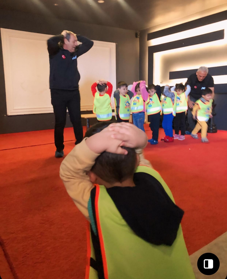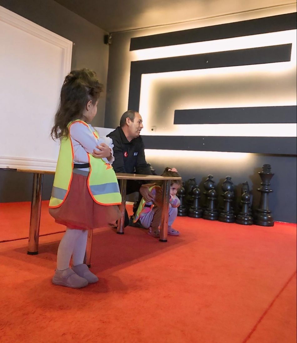 AFAD görevlileri tarafından miniklere deprem öncesi, deprem sırasında ve sonrası neler yapmaları gerektiği hakkında tatbikat yaptırıldı.