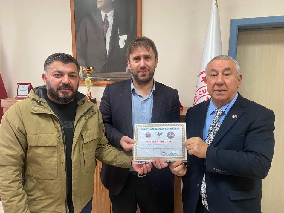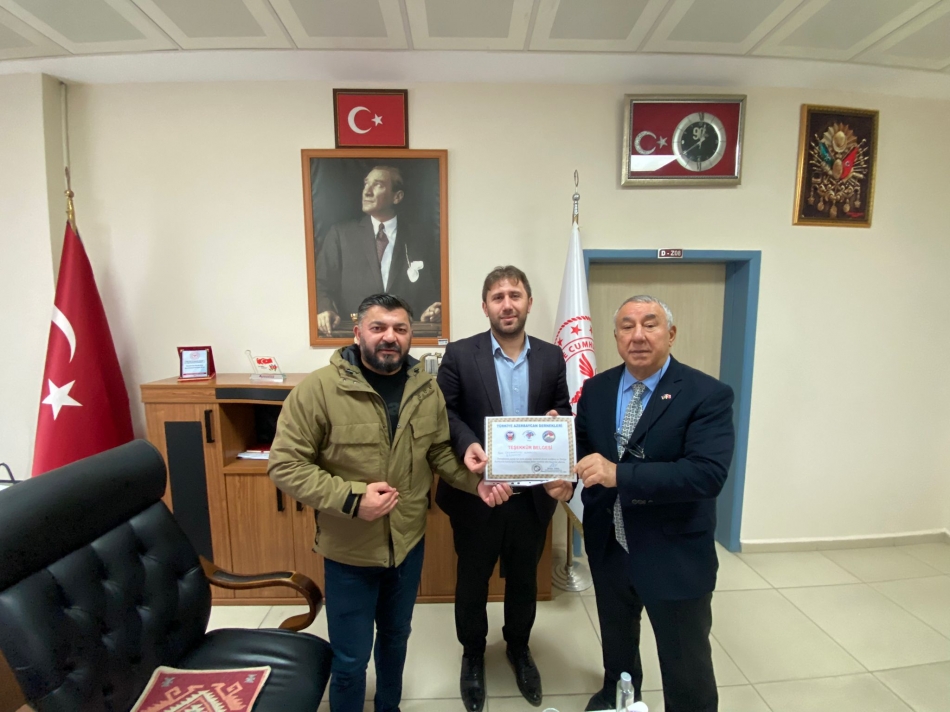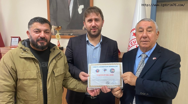 Türkiye Azerbaycan Dostluk Dernekleri federasyonu Genel Başkan yardımcısı ve Iğdır Azerbaycan Evi Derneği başkanı Serdar Ünsal, Türkiye Azerbaycan kardeşliğine destek veren Iğdır Dr. Nevruz Erez Devlet Hastanesi başhekimi Selahattin Karagöz’e dernek yönetim kurulu üyesi Özkan Aydın ile Birlikte teşekkür belgesi verdi.