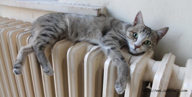 Isınmak için çıktığı petek üzerinde durgun bir halde kendisine bakan vatandaşları izleyen kedi, kendisini izleyen vatandaşlara aldırmayarak sıcak kaloriferin tadını çıkardı. Bir süre kalorifer peteğinde ısınan kedi  daha sonra p/etekten  inerek sokağa geri döndü.