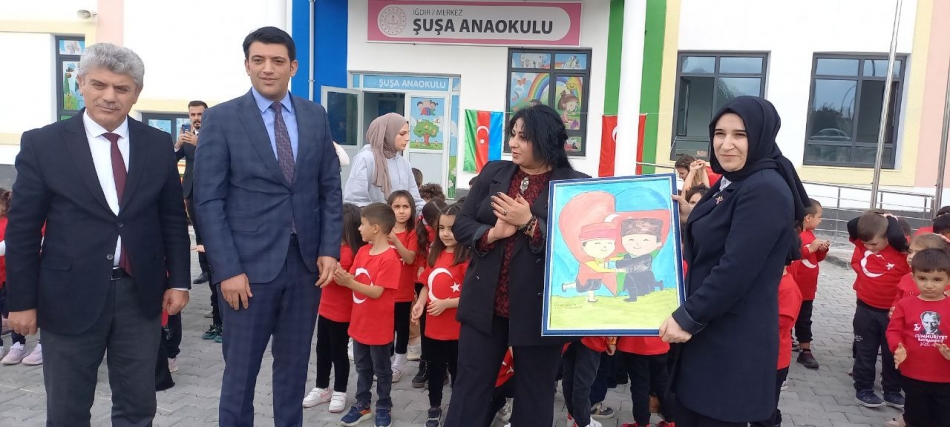 Minik öğrencilerin Türk bayraklı tişörtlerle yaptıkları Cumhuriyet bayramı gösterisi ilgiyle izlenirken Milletvekili Ulviye Hamzeyeva, Azerbaycanlı sanatçıların yaptığı resimleri Harı Bülbül tablosunu Iğdır Milli eğitim Müdürü Servet Canlı’ya hediye etti