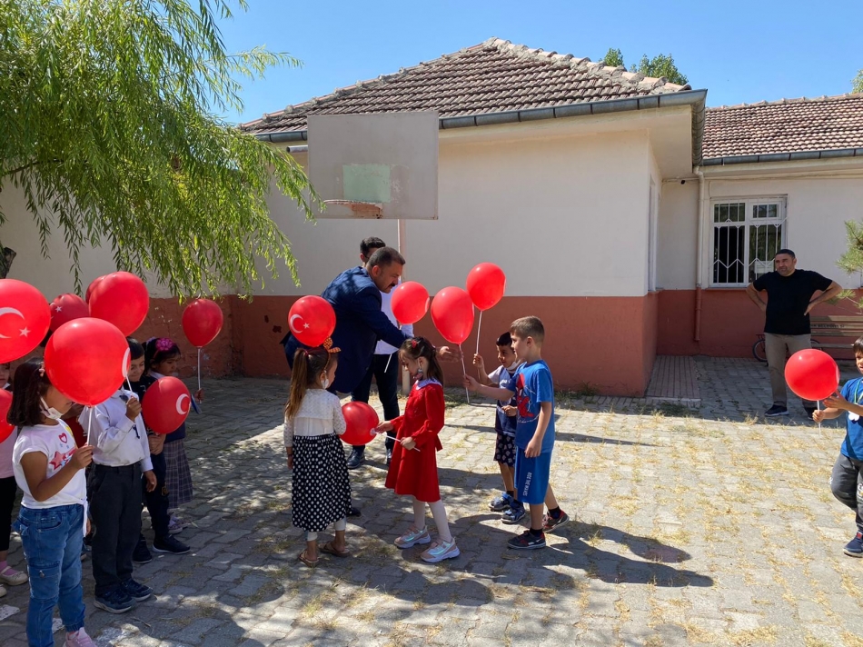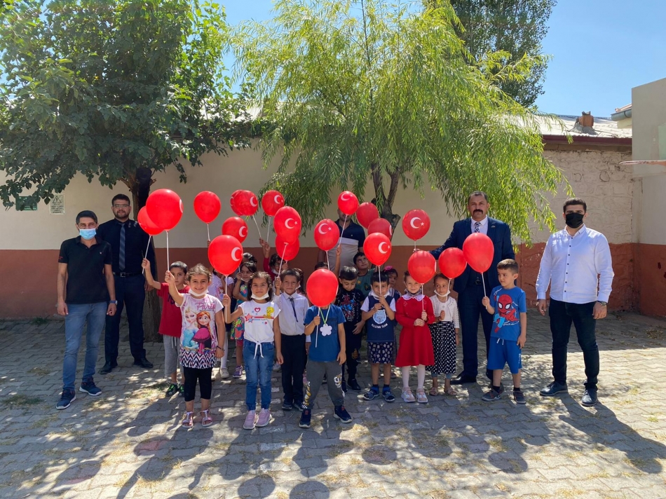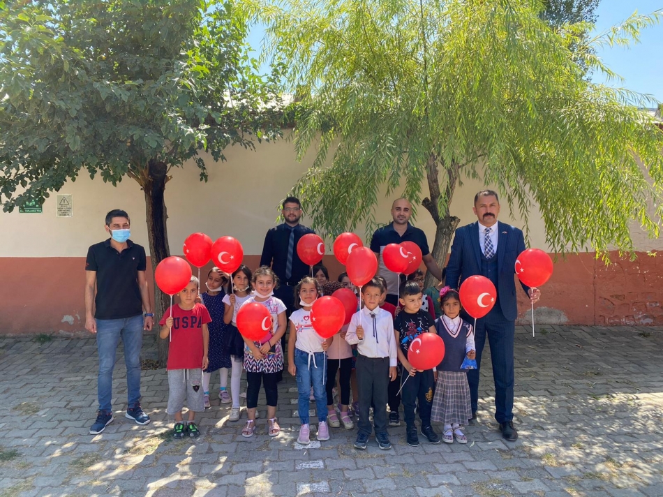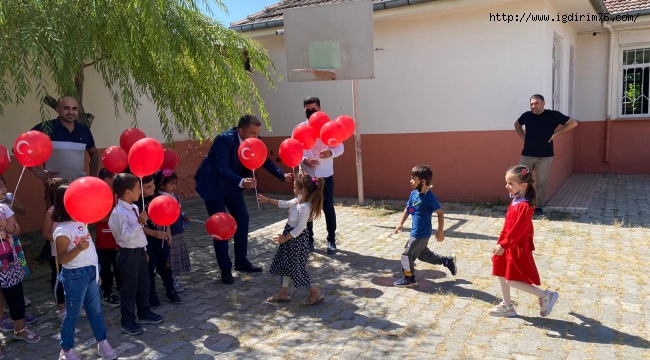 TÜRKAV Iğdır İl Başkanı Kurban Parlar ve yöneticiler öğrencilere Türk bayraklı balon hediye etti.